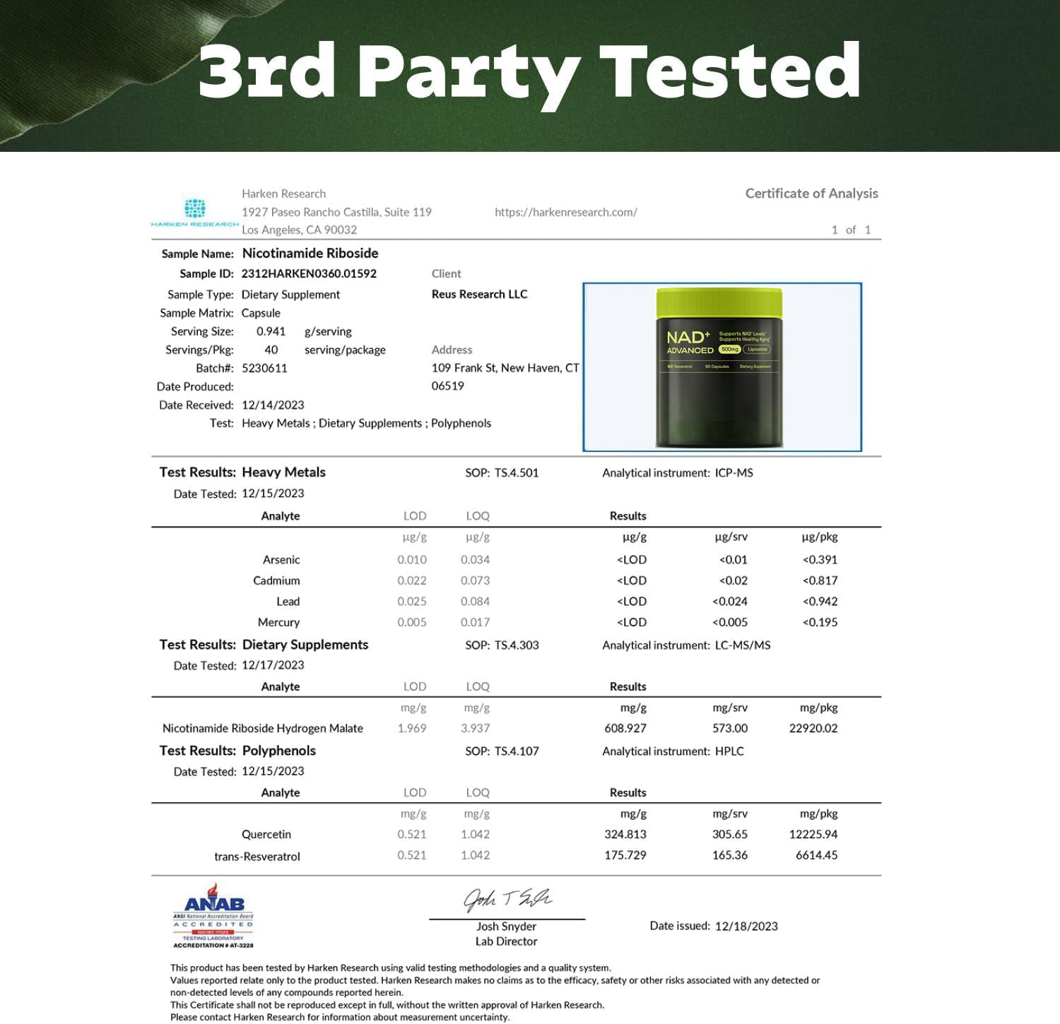 - TESTED IN THE USA: Our NR, Resveratrol, Quercetin supplement is third-party tested in the USA to ensure its purity and effectiveness. Certificate available upon request. Get back to feeling your best with NAD+ supplement booster.